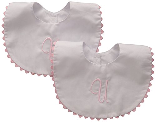 Set of 2 embroidered bibs;Personalized with a single letter for a keepsake;Hook and loop closure at the back of the neck for easy on and off;Trimmed in baby pink and sure to coordinate with almost any outfit;Great new baby gift