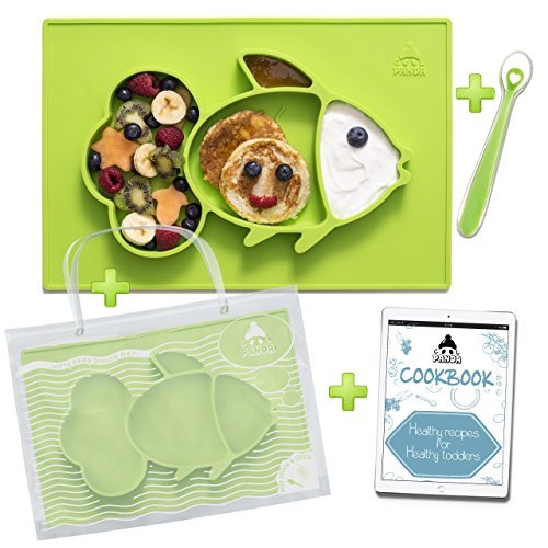 Cool Panda Fun Silicone Feeding Placemat for Babies Portable & Reusable Travel Bag Spoon and Healthy Recipes Ebook Included Non-Slip Suction Plate Large Size Set: 15x10x1 Green [並行輸入品]