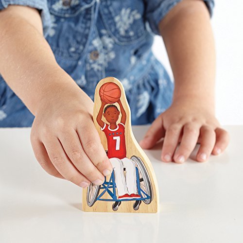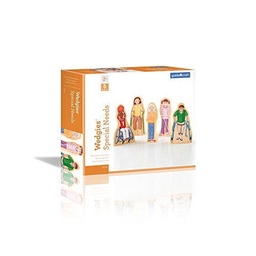 Wedgies, Guidecraft's classic wooden toy, balances both dramatic play and block play with colorful, charismatic characters. Five active children with special needs promote positive awareness. Solid wood, wedged-shaped characters feature double-sided artwork with intricate details and personality, and wide, no-topple bases. 4.5"H figures.