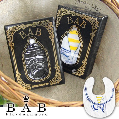 赤ちゃんだってキメたい日があります。そんな赤ちゃんのためのオシャレアイテム、トロンプルイユ(だまし絵)柄のベビー用よだれかけ「BAB」、装いも新たに新登場!コットン100%で赤ちゃんも嬉しいふわふわやわらかイイ心地♪クールガイもキュートガールもオシャレにキマるラインナップ!出産祝い等のギフトにもオススメなボックスに入れてお届けします。