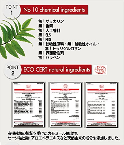 - 無添加成分:サッカリン、色素、人工香料、SLS、界面活性剤、パラベン