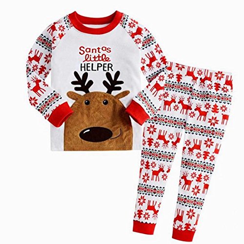 Puresinoパジャマ キッズ 子供服 クリスマス パジャマ ルームウェア 長袖 トナカイ柄 Tシャツ上下セット 男の子 女の子 (4T, ホワイト)