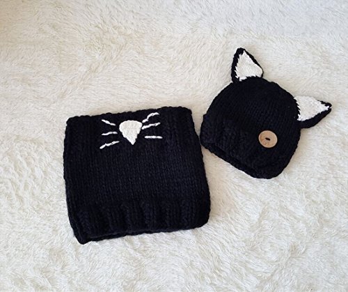 Puresino キッズ ニット 帽子+ネックウォーマー 2点セット マフラー キッズ ネコ耳 ネックウォーマー 秋冬 防寒 保温 子供用 (ブラック)