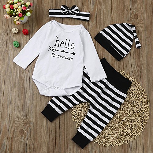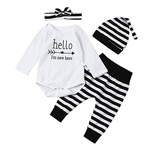 (プタス)Putars ベビー服 子供服 ロンパース 上下セット 男の子 女の子 長袖 ストライプ柄 NEW HERE 帽子付き 可愛い 秋 冬 新生児 歩行服 出産お祝い 記念日 プレゼント 0-24ヶ月