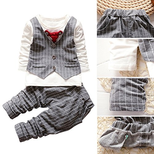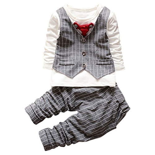 QIAONAI 男の子 スーツ ベビー服 子供服 男の子 フォーマル スーツ ロンパース 上下2点セット Tシャツ+ズボン 長袖 チェック柄 ベスト ネクタイ 結婚式 入園式 発表会 七五三 お宮参り キッズ ボーイズ 80-110cm (100cm, グレー)
