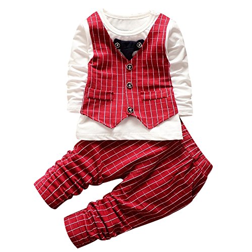 QIAONAI 男の子 スーツ ベビー服 子供服 男の子 フォーマル スーツ ロンパース 上下2点セット Tシャツ+ズボン 長袖 チェック柄 ベスト ネクタイ 結婚式 入園式 発表会 七五三 お宮参り キッズ ボーイズ 80-110cm (90cm, レッド)