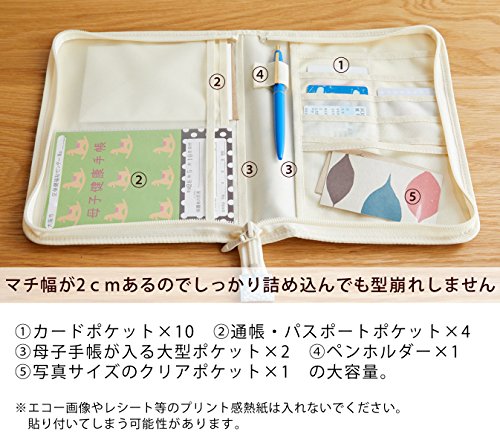 - カードポケット×10、通帳・パスポートポケット×4、母子手帳が入る大型ポケット×2、写真サイズのクリアポケット×1、ペンホルダー×1の大容量。マチ幅が2cmあるのでしっかり詰め込んでも型崩れしません。※クリアポケットにはエコー画像やレシート等のプリント感熱紙は入れないでください。貼り付いてしまう可能性があります。