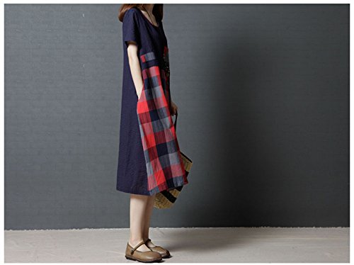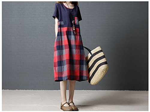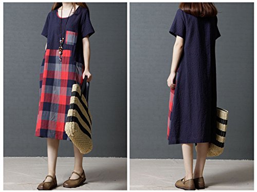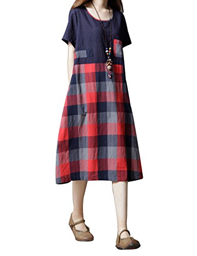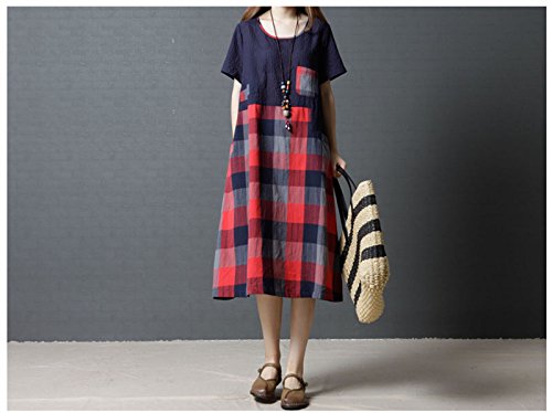 (キュミオ) QeMIO ワンピース レディース aライン 着痩せ 体型カバー ロング丈 ゆったり チェック柄 春 夏 秋用 リネン 麻 コットン 半袖 両側ポケット 大きいサイズ マタニティワンピース 大人 可愛い 森ガール