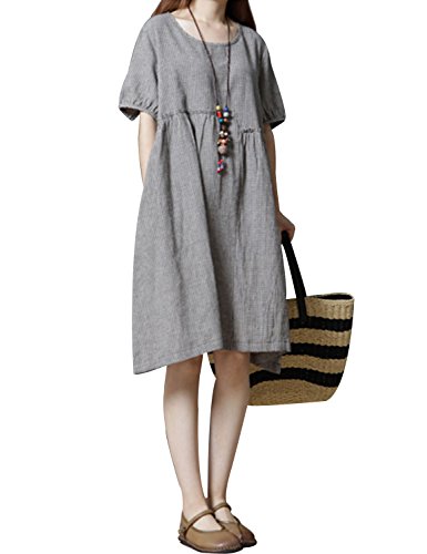 (キュミオ) QeMIO ワンピース レディース aライン ミニ丈 着痩せ 体型カバー ゆったり チェック柄 春 夏 秋用 リネン 半袖 両側ポケット 大きいサイズ マタニティワンピース 大人 可愛い 森ガール