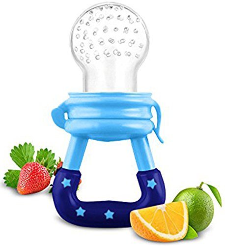 Variety of feeder uses - Use with, fresh or frozen fruits, vegetables, meats, ice chips, breast milk or use it to administer medicine to your baby.;2-in-1 FOODFRUIT FEEDER HAS FOOD GRADE SILICONE NIPPLE - Made from the highest food grade silicone which is BPA Free, Lead Free, Petroleum Free, Latex Free and Phosphates Free.;It relieves your baby's aching itchy gums - By chewing on the soft silicone textured nipple your baby will soothe their gums.;INTRODUCE SOLID FOODS SAFELY - Moms can relax knowing that their little one can be introduced to solid foods through our food feeder. The tempered texture nipple holes DO NOT allow chunks of food through which could induce choking.;Easy to clean - Clean-up is very easy unlike other products that use the mesh material, all you do is wash in warm soapy water or boil the feeder nipple for sterilization. The food grade silicone is stain resistant and won't spot or stain like similar mesh bag products.