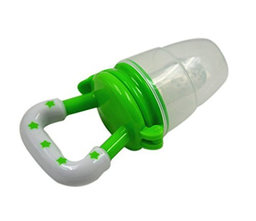 Variety of feeder uses - Use with, fresh or frozen fruits, vegetables, meats, ice chips, breast milk or use it to administer medicine to your baby.;2-in-1 FOODFRUIT FEEDER HAS FOOD GRADE SILICONE NIPPLE - Made from the highest food grade silicone which is BPA Free, Lead Free, Petroleum Free, Latex Free and Phosphates Free.;It relieves your baby's aching itchy gums - By chewing on the soft silicone textured nipple your baby will soothe their gums.;INTRODUCE SOLID FOODS SAFELY - Moms can relax knowing that their little one can be introduced to solid foods through our food feeder. The tempered texture nipple holes DO NOT allow chunks of food through which could induce choking.;Easy to clean - Clean-up is very easy unlike other products that use the mesh material, all you do is wash in warm soapy water or boil the feeder nipple for sterilization. The food grade silicone is stain resistant and won't spot or stain like similar mesh bag products.