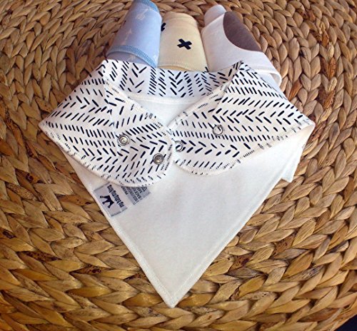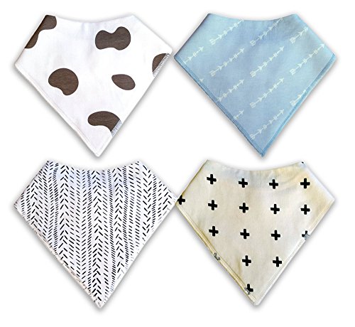 Durable baby bandana bibs gift set - top layer made of 100% organic cotton knit and absorbent coating;Absorbent drool bibs - soak up dribble much better than old bibs, the double layer provides a thick;Adjustable neck with nickel-free snaps - suitable for children aged 0-3 years;Extra cloth up in front up to the chin: catches most of the spills up before they sink into baby's a;Colors are: cow bib, in white and brown, crosses bib, in ivory and black & arrows bib in light