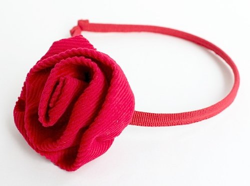 色が美しいコーデュロイ製の大きめの巻きバラ付きカチューシャです。