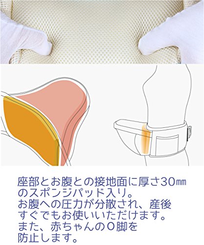 - <座部>芯材には発泡ポリプロピレン(EPP)を採用。軽量で、衝撃に強いだけでなく、衝撃を和らげる丈夫な芯材です。座部は30°の傾斜がついており、赤ちゃんを座らせると自然にパパママに体が沿います。座部とお腹との接地面に厚さ30㎜のスポンジパッド入り。お腹への圧力が分散され、産後すぐでもお使いいただけます。また、赤ちゃんのО脚を防止します。