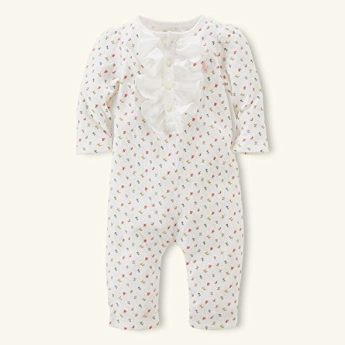 前4つボタン。股下8つホック。 胸元にピンク色のポロマーク刺繍。 柔らかくとっても上質なコットン素材。 愛らしい小花のプリント柄。 胸元のフリルもかわいいですね~。 ラルフらしくて、上品でかわいい1枚です。 出産祝いにもお勧めです。 ☆素材:綿100% ☆色:ミルク/ミニフラワープリント