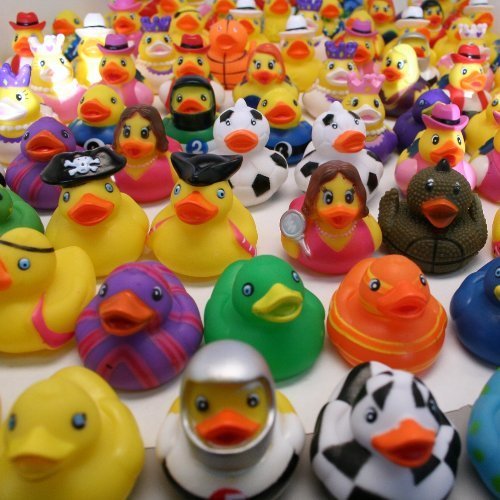 Get a great variety of rubber ducks at a great price with the 2 inch rubber duck assortment. Get a large variety of rubber ducks without needed to buy a large variety of ducks yourself. This great assortment is approximately 100 ducks and comes with a varying assortment of ducks, no two packages will be the same. You will also get duplicate ducks within the assortment of 100, but you will definitely get a good assortment. Never held a Duck Race Fundraiser before? Don?t worry it?s an easy and great fundraiser for any event. Start by purchasing your duck race ducks and then number each ducky. ?Sell? each duck to the duck race fundraiser participants. You don?t actually give the ducks to the participants, but keep track of whoever bought each duck (the reason for numbering the ducks) Then when it is time for your duck river race, dump all the ducks into the river and let the duckies race to the finish line. Once the duckys reach the finish award the first duck or first few ducks to cross the finish line. With our huge selection of themed rubber ducks, we surely have the right racing ducks for your duck race fundraiser.An even more simple alternative to a duck river race is the duck pond game. Again number each duckie and simply place them into an inflatable pool or larger water container. Have the guests select a duckie and then they win the prize associated with the number. This is a great game for kid?s parties or younger children?s themed events. For the big kid in all of us make this game more challenging --buy a large amount of ducks and only number 2 or 3, this way you can give away only 2 or 3 larger prizes. This is a great game to have at a duck river race. Charge each guest depending on the value of your prizes, for one chance to pull the winning ducky. We recommend having more than one prize on the off chance that the correct duck gets drawn quickly, this way you can continue the duck pond game for a longer time. All of our rubber ducks ar