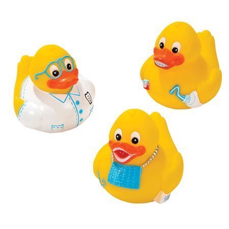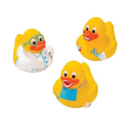 This set of 12 rubber duckys are just adorable. You'll receive a combination of the three designs shown for a total of 12 ducks. Each ducky measures approx. 2" x 2". They have a hole in the bottom and squeak. They will float upright in still water, but will not upright themselves if tipped over. These make great little party favors or gifts for dental offices to pass out to young patients.