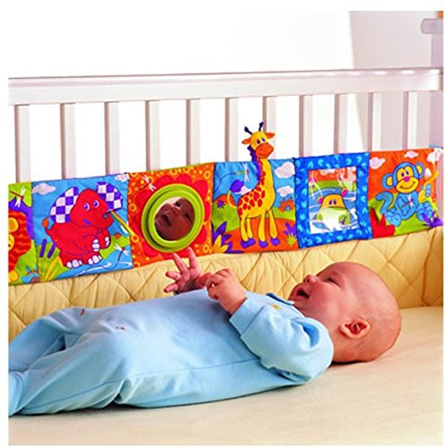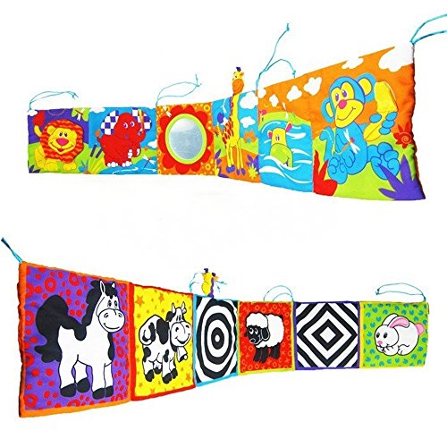カラフルでわかりやすい、はっきりとした絵柄でライオンのたてがみやキリンの顔等触るとカサカサと、またうさぎを押しても音がなり赤ちゃんの興味・関心をそそる仕掛けになっております。鏡に顔を映してみるのもよいでしょう。