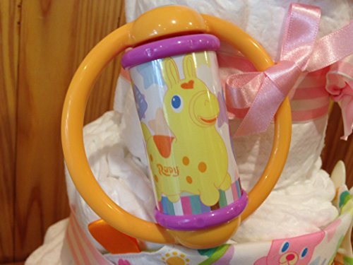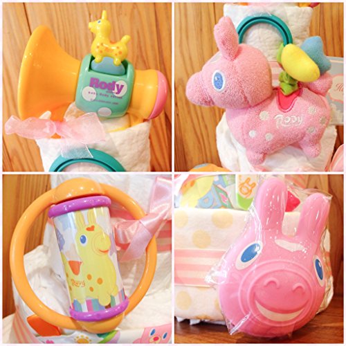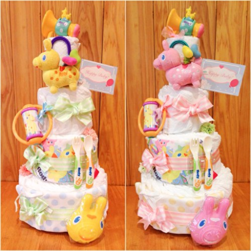 【もらって嬉しい!】豪華なロディ4段おむつケーキ!たっぷり6点おもちゃと優しいデザインのお洋服付き☆ (きいろ)