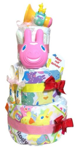 人気No.1 ロディおもちゃ4点も付いた おむつケーキ 出産祝い・ハーフバースデー対応 ピンク (ハーフバースデーM)
