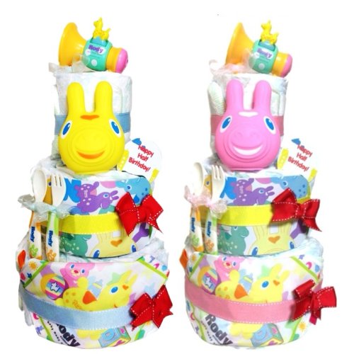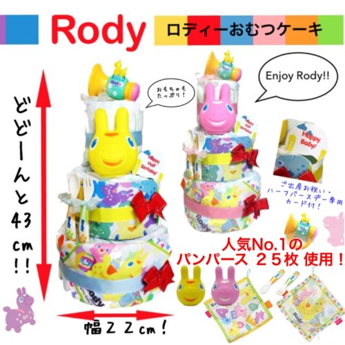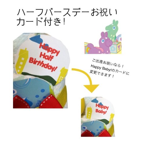 ご出産・ハーフバースデーおめでとうございます! まだ甘いものが食べられないあかちゃんへ、人気のRodyおむつケーキを贈りませんか?対象年齢6ヶ月〜のおもちゃがたっぷり4点含まれていますので、ご出産のお祝いでしたら、しばらくはそのままお部屋を華やかに演出するオブジェとして、ハーフバースデーのお祝いでしたら、あかちゃんは楽しいおもちゃですぐに遊べて大喜びです!ねんねでも、お座りが出来るようになってからでも、おむつケーキと一緒に記念写真を撮るのも良いですね! 可愛くて実用的なおむつケーキは、あかちゃんとそのご家族に喜んで頂ける事、間違いなしです! ☆おむつケーキは全てギフトラッピングされ、ホワイトのお箱でお届けいたします。 値段の記載された納品書や請求書などは一切同封されませんのでご安心くださいませ。