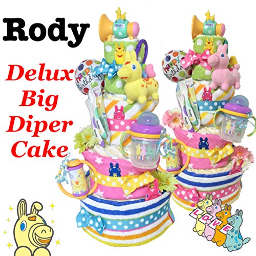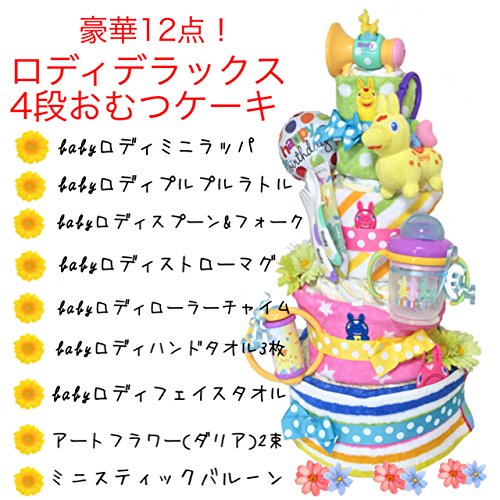 ご出産おめでとうございます! 人気のRodyおむつケーキが豪華4段♪たっぷりボリュームで新登場しました! 嬉しいロディタオルやおもちゃ、カトラリーまであかちゃんへ必要なものがセットになったおむつケーキです。職場やご友人、ご親戚のお祝いにふさわしい、あかちゃんらしいポップなデザインです。