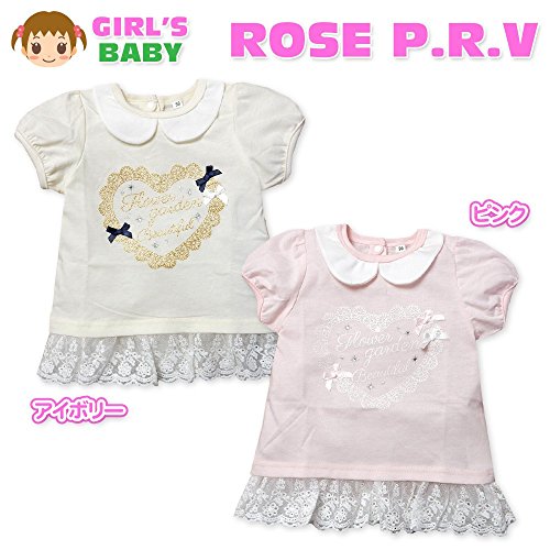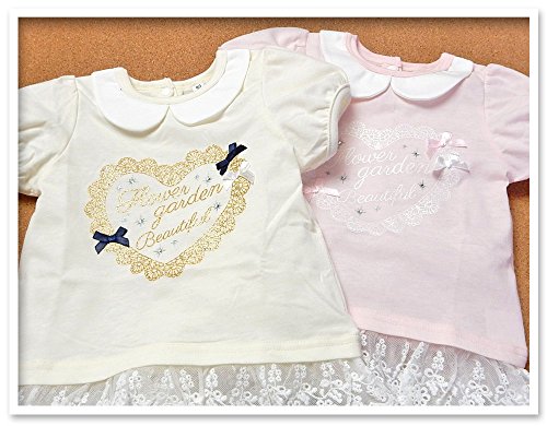 (ピンク/80cm)ベビー服 女の子 Tシャツ 丸衿 パフスリーブ 裾レースフリル ラメプリント ストーン装飾 リボン 女児 ベビー