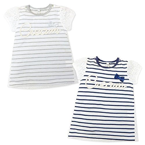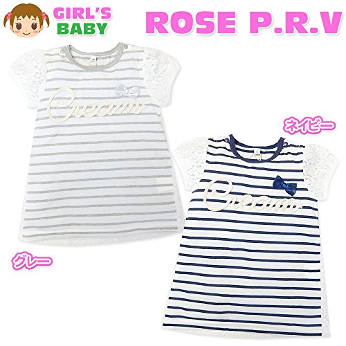 (グレー/95cm)子供服 女の子 チュニック 半袖 プリント レース装飾 テールカット レース袖 リボン装飾 刺繍ロゴ ボーダー スナップボタン 女児 ベビー