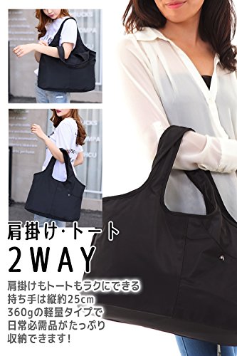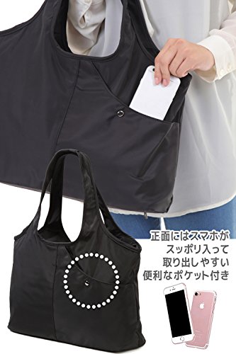 軽量、大容量タイプのナイロン素材トートバッグ。正面、背面、底面にポケットが計3つ。日常必需品がたっぷり入ります。底面には折りたたみ傘を入れるのに便利なポケット付き。肩掛けもトートもラクに出来る持ち手は縦約25cm。どんなファッションにも合わせやすいシンプルでスタイリッシュなデザイン。