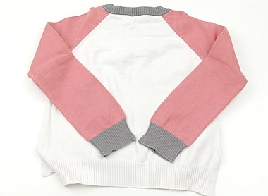 実際のサイズ表記は4です。薄手のニットです。全体に色褪せや毛羽立ちがあり、右胸に2mm程の薄茶色の汚れがあります。まだまだ普段着として活躍してくれそうです。
