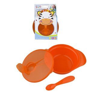 First Steps travel feeding bowl with lid and spoon;Four assorted colours: blue, green, pink and purple with Animal Design Packaging;Suitable from 6 months onwards;Microwave and dishwasher safe BPA free - Material: PP;Approximate measurements: 14cm diameter x 5.5cm Care and Usage Instructions Included