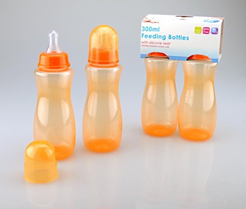 Pack of 2Orange baby feeding bottles 300ML;Available in Pink,Green,Orange,Purple and Blue in 150ML and Pink,Green, Orange and Blue in the 300ML;Bottles are BPA Free and suitable for use from birth;Care and Usage instructions included;Approximate measurements: 14cm x 6cm diameter