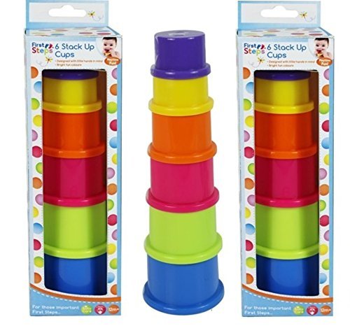 2 x Packs Of First Steps Pack Of 6 Bright Coloured Stack Up Tower Cups Learning Activity Toy Assorted bright colours: blue, purple, orange, yellow, green and pink Suitable from 6 months onwards Largest cup measures approximately 7cm diameter x 5cm Box measures approximately 25cm x 7cm x 7cm Please note that the colour for the size of cup may differ from image. (the largest cup may not be blue) Plastic.