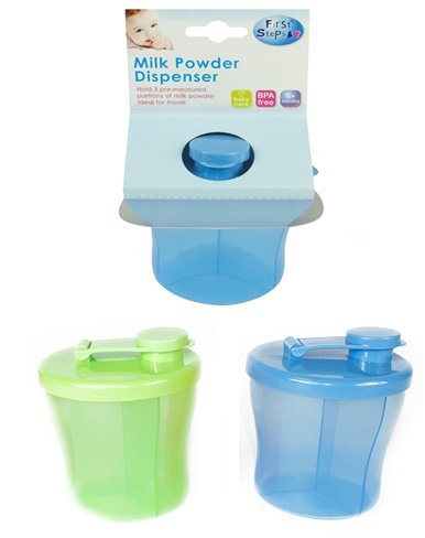 First Steps milk powder dispenser - Three sections for milk powder which can be poured separately;Pack of 2 in either Blue or Pink;Phthalate safe and BPA free;Suitable from birth onwards;Approximate measurements: 9cm diameter x 8.5cm