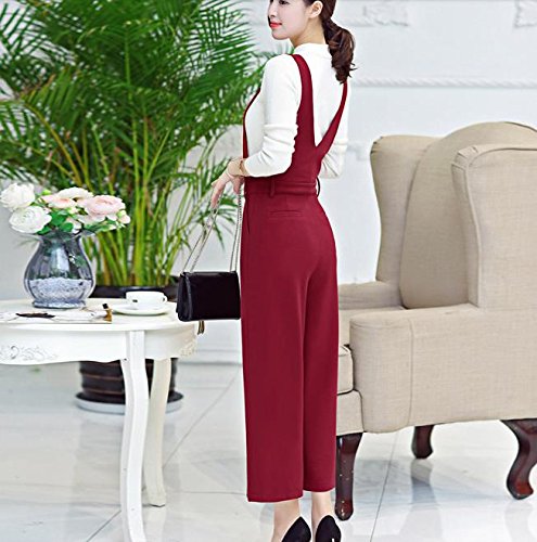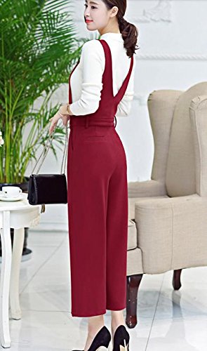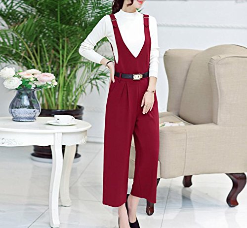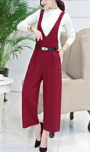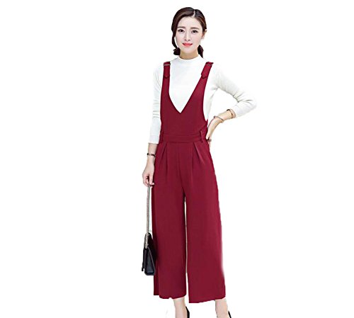 [RSWHYY] レディース サロペット オールインワン オーバーオール サスペンダー カジュアル 春秋 Vネック ガウチョパンツ ハイウェスト 無地 つなぎ服 ゆったり 九分丈 レッド S