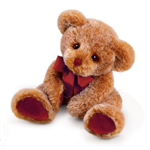 Soft brown plush bear with plum paws and matching bow. Bears measures 14 inches