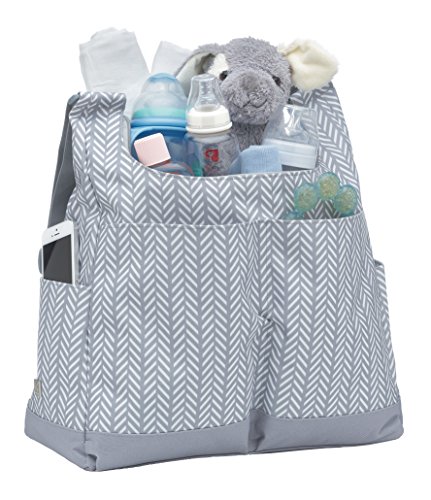 Designed in Australia and featuring a modern grey herringbone print on lightweight, durable, easy-to-clean fabric;Large, extra-tall main compartment with a wide, expanding zipper opening;Five interior organizational pockets;Includes padded changing pad, water-proof wet pouch, insulated bottle cooler pocket and wipeable, hygienic pacifier pocket;Four exterior pockets and wide, adjustable shoulder strap