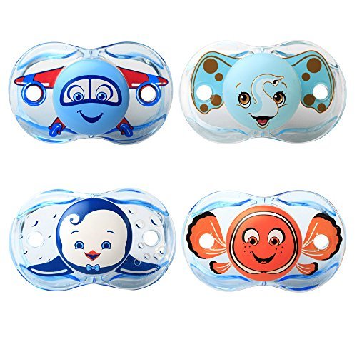You will receive (4) Keep-It-Kleen Pacifiers:Adam Airplane, Elfy Elephant, Ethan Penguin, and Finley Clown Fish;Nipple stays clean - Closes when dropped! Cleaner and healthier for baby.;0-36 months Silicone Orthodontic;Conforms to US Consumer & Product Safety Commission requirements;BPA Free - Plastic made in USA
