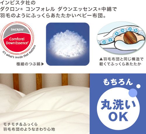また、繊維の間にしっかり空気を含み、あたたかさ(保温性)を持続。まさに羽毛布団と同様の機能を持った、デリケートなお肌のベビーにぴったりのお布団