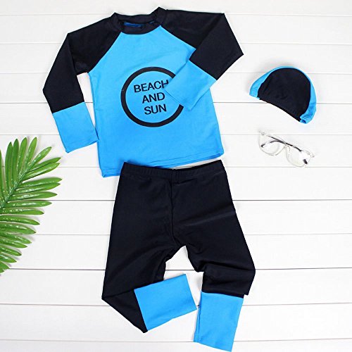 RainKind 子供水着 女の子水着 男の子水着 男女兼用 帽子付き水着 男児女児水着(スイムキャップ・長袖ラッシュガード・ズボン水着) (L, プルー)