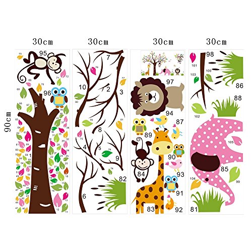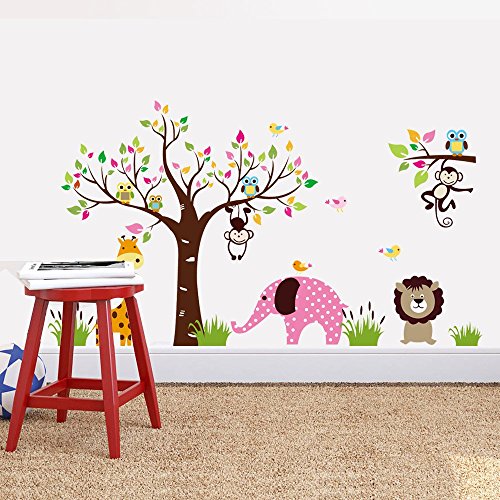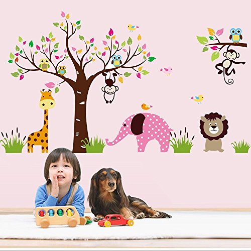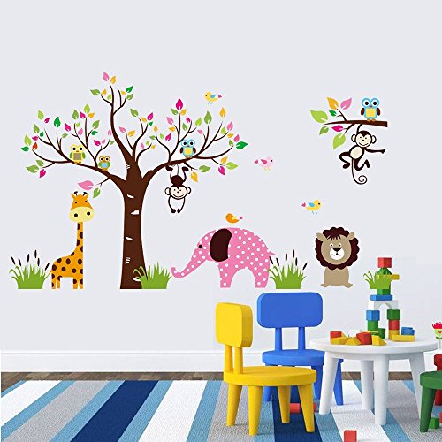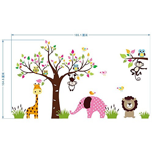 Animal World, Giraffe, Pink Elephant, Lion, Monkeys, Owls Are Having Fun Around the Colorful Tree, 185.1cm*104.6cm Removable Nursery Room Kindergarten Wall Sticker [並行輸入品]