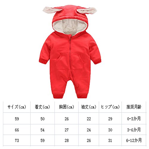 サイズ:59cm 推奨身長:52-59cm 推奨月齢:0-3か月サイズ:66cm 推奨身長:59-73cm 推奨月齢:3-6か月サイズ:73cm 推奨身長:73-80cm 推奨月齢:6-12か月もこもこ、ふわふわシキギーの生地、肌触りは良く、敏感肌の赤ちゃんも使える。可愛いうさぎ耳付き、色も明るい、毎日着るでも楽しいです。フード付き、ワンピースでベビーを足から頭まで、しっかり寒さからガードして、お出かける時でも暖かい、冬で大活躍です。ファスナーで前開き長袖、着脱便利なので、ベビーへのおむつ替えも楽ちんです。出産祝い、子供誕生日、クリスマス、正月などのプレゼントとしてお勧めいたします。液温は、30℃を限度とし、弱い手洗いがよい。塩素系漂白剤による漂白はできない。手絞りの場合は弱く、遠心脱水の場合は、短時間で絞るのがよい。つり干しがよい。