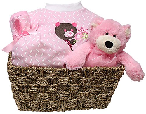 - This 5-piece gift set includes: 1 Footie 1 Blankie 1 Cap 1 Teddy Bear 1 Basket