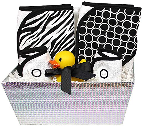 2 Printed fabric hooded bath towels;2 Embroidered matching wash cloths;1 Rubber ducky, 1 re-usable container;Overall Gift Set Size: 12 across by 13 tall;Machine Washable/Tumble Dry;Overall Gift Set Size: 12 inches across by 13 inches tall