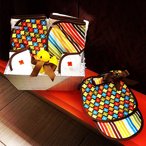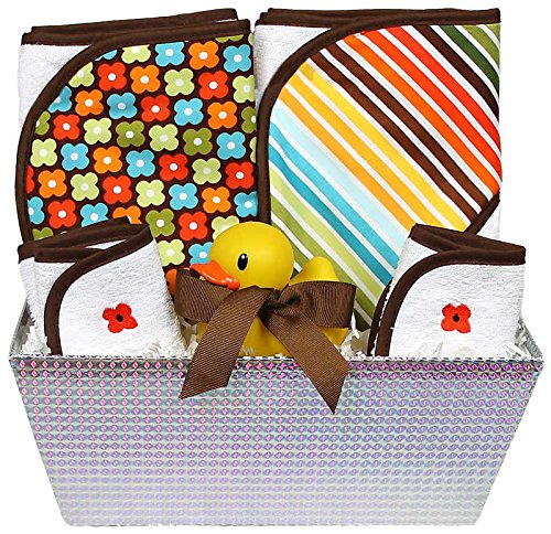 2 Printed fabric hooded bath towels;2 Embroidered matching wash cloths;1 Rubber ducky, 1 re-usable container;Overall Gift Set Size: 12 across by 13 tall;Machine Washable/Tumble Dry;Overall Gift Set Size: 12 inches across by 13 inches tall