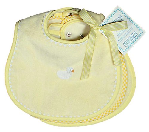 3 bibs: 1 Appliqued crocheted duck and 2 plain;Water repellant backing;Trimmed with white ric rack, yellow gingham, yellow binding;Measures 9 across by 11 from top to bottom;Machine Washable/Tumble Dry