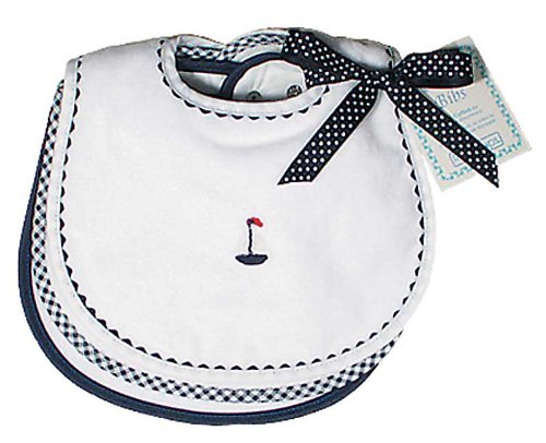 3 bibs: 1 appliqued crocheted sailboat and 2 plain;Water repellant backing;Trimmed with navy ric rack, navy gingham, navy binding;Measures 9 inches across by 11 inches from top to bottom;Machine washable/tumble dry