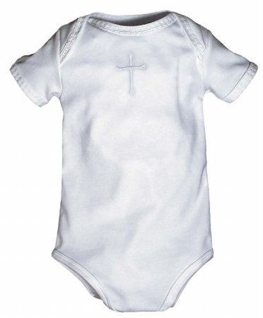 Raindrops brings you our 100% cotton, white interlock, embroidered Cross body suit, made from the best cotton on the planet, especially for your precious newborn baby boy or girl. This is a nice weight interlock, not jersey, which means it will keep your baby warm and comfortable, since it is nicer and softer than most others. It is finished with 2-needle cover stitching, which will provide longer wear and will hold up better throughout each wash. Don't miss the unique white cross embroidery around the neckline and sleeves! This body suit can be worn on its own or used under the Christening outfit. It will co-ordinate with a lot of our bibs and even a burp cloth. Raindrops has been manufacturing top quality, unique baby garments in the USA, since 1936.