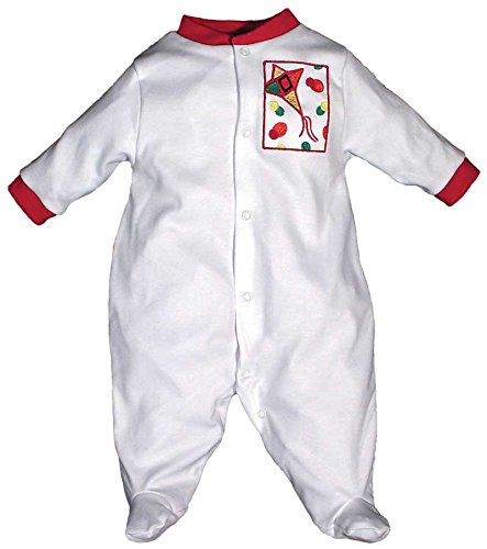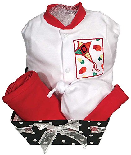 Footie embroidered with a red kite;Matching receiving blanket, 28 x 34;Matching cap;Overall gift set size: 8 across by 11 tall;Machine washable and tumble dry