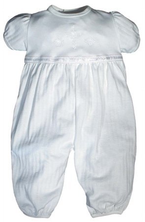 Raindrops Opal Christening Party Girls Coverall is part of a great group meant to go on a baby, after the Christening, for the party, so she will be more comfortable and still dressed for the day. This short sleeve coverall is made in with 100% cotton, textured, patterned white knit fabric. It is embroidered with a cross and trimmed with an opalescent ribbon. This is for the baby girl who is a little older. It matches a footie, a blanket, a cap, a pair of booties, a body suit, a gown and a boys coverall. This short sleeve coverall is our girl's style and it is available in a long sleeve version, also. Raindrops has been manufacturing top quality, unique baby garments in the USA, since 1936.